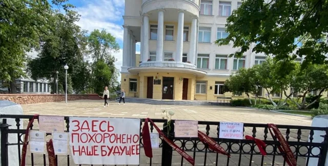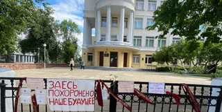 Кроме того, выпускники оставляют на заборах этих школ плакаты. В частности, на одном из них написано, что "здесь похоронено наше будущее". Также кто-то поставил возле гимназии банку с копейками и написал, что это "последние деньги, которые я сдаю на школу".