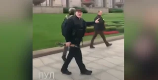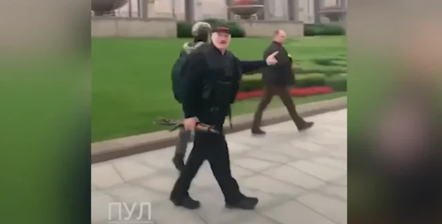Лукашенко входит в здание, держа в руке автомат похожий на АК, без рожка. Президент одет в бронежилет. На видео Лекашенко уточнил у охраны, остался ли кто-то еще "там" – судя по всему, на проспекте Победителей.