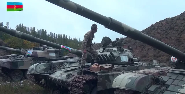 Минобороны Азербайджана опубликовало два новых видео с фронта в Нагорном Карабахе, на которых азербайджанская армия исследует захваченные позиции отступившего подразделения армии Карабаха, а позже демонстрирует три танка, военный грузовик, ПТРК и коробки с боеприпасами, в качестве военных трофеев.