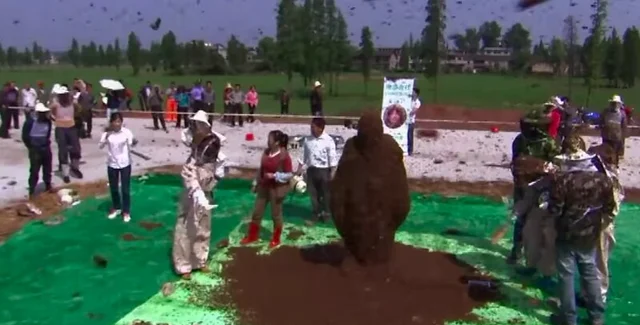 Мужчина был без защитного костюма. На него высыпали несколько тазов с пчелами. В конечном итоге тысячи насекомых покрыли молодого человека с ног до головы в несколько слоев, превратив его в "пчелиную статую".