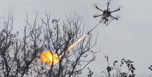 В видеоролике, опубликованном Blue Sky Rescue, показано, как дрон парит на высоте дерева, подлетает к гнезду, висящему на ветке, приближается к нему и поджигает гнездо.