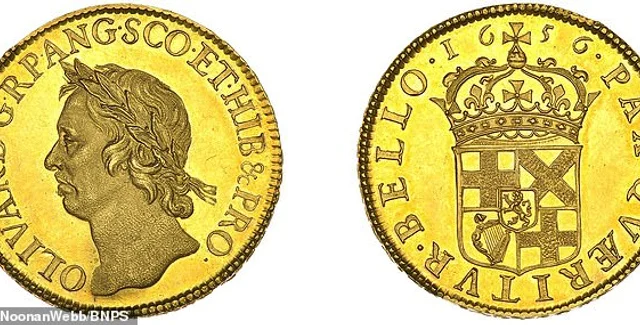 На лондонском аукционе продадут уникальную золотую монету достоинством в 50 шиллингов, отчеканенную еще в 1656 году. На ней изображен Оливер Кромвель, который в то время занимал высокий пост лорда-протектора. Об этом пишет