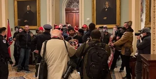 Среди ворвавшихся в Капитолий были люди в костюмах викингов и в военной амуниции. Охрана Конгресса США пыталась заблокировать двери в зал заседаний.