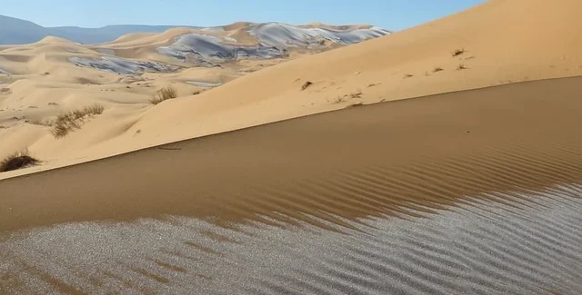 В пустыне Сахаре неожиданно выпал снег, дюны покрылись инеем (фото)