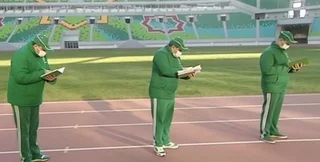 На кадрах ролика видно, как на стадионе люди в одинаковых спортивных костюмах быстро делают записи в блокноты в присутствии Гурбангулы Бердымухамедова.