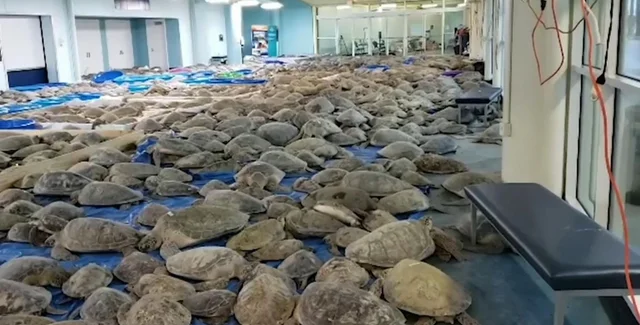 "Тысячи морских черепах доставили в конференц-центр после того, как добровольцы спасли более 3500 из них от минусовых температур во время рекордного зимнего шторма", – говорится в сообщении АВС News.