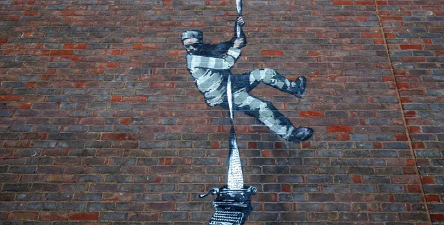 Изображения побега из тюрьмы была самой новой работой художника, он ее изобразил на стене заброшенной английской тюрьмы. Рисунок изображает побег заключенного, который спускается по веревке из листов бумаги. Они появляются из пишущей машинки.