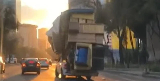 Все дело в том, что на багажник этого транспортного средства переезжающий хозяин умудрился погрузить все домашние пожитки, среди которых были шкафы, кровати, комоды, кушетки, столы и даже металлический предмет, напоминающий бензобак.