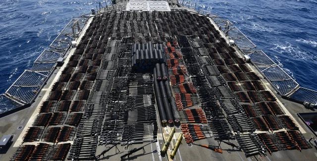 В ходе патрулирования моря ВМС США обнаружили корабль без опознавательных знаков с огромным количеством оружия.