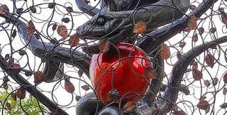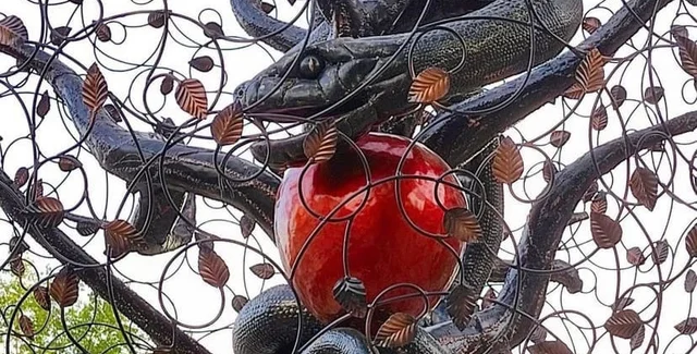 Скульптура выглядит как дерево, а на ветках сидит Змей-искуситель и обвивает запретный плод.