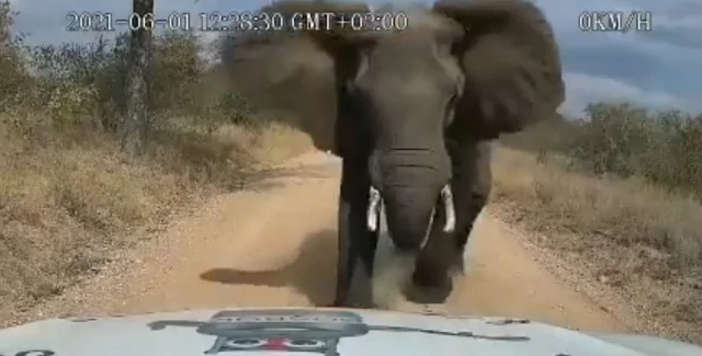 В Национальном парке Крюгера (ЮАР) разозлившийся слон смял капот автомобиля и вытолкал его с дороги.