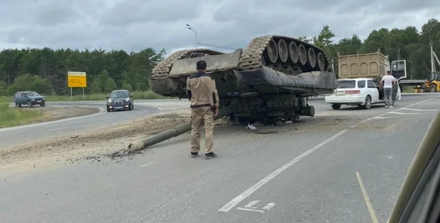 Утром 12 июля жители Сахалина могли наблюдать необычную картину на одной из дорог возле Южно-Сахалинска. Посреди объездной дороги в районе села Троицкого на башне лежал танк. Его потеряли военные при транспортировке на автомобильном прицепе, сообщило издание "КП".