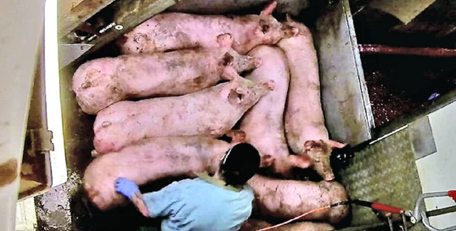 Некоторых из коров, которые были хромыми, били и толкали, а ноги свиней, судя по видео, отрезали, когда те находились в кандалах, подавая признаки жизни.