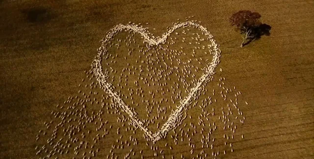 Для этого он использовал овец, с помощью которых создал на поле огромное сердце. Получить идеальную форму получилось не с первого раза. Бен несколько дней раскладывал корм особым образом, чтобы овцы подбегали к нему, однако первые попытки провалились, потому что животные образовывали фигуры, далекие от идеала. И хотя у тети фермера было отличное чувство юмора, подобные инсталляции она вряд ли бы поняла.