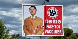 Рекламные щиты с карикатурами на президента Франции Эммануэля Макрона находятся в Тулоне и Сейн-сюр-Мер. На одном из билбордов французский лидер с усами Адольфа Гитлера обращается к народу: "Подчиняйтесь, делайте прививки! (Obéis, fais-toi vacciner)".