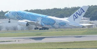 Любопытно, что среди этих лайнеров был и аэробус A380 авиакомпании All-Nippon Airways, весь фюзеляж которого украшали изображения черепах. Эти рисунки появились в прошлом году, когда упомянутая авиакомпания открыла рейсы на Гавайи, где черепахи считаются священными животными.