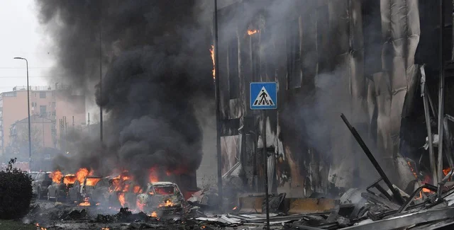 В результате аварии загорелся офисный блок и несколько припаркованных автомобилей. На земле никто не пострадал.