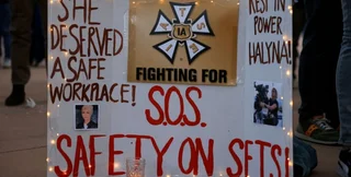 Плакат на церемонии прощания с оператором Галиной Ханчинс. Надпись призывает обеспечить безопасность на рабочем месте.