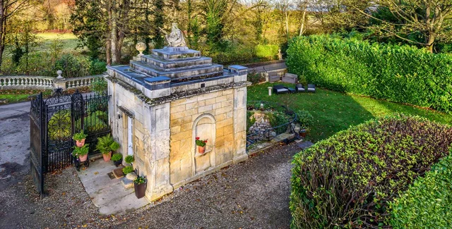 Роскошный домик построен из блоков известнякового ашлада, а фигура воина на коленях находится на ступенчатой крыше.