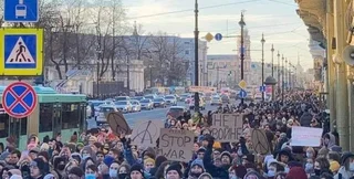В центре города маршируют целые колоны митингующих по Мойке и по Гражданской улице. Они скандируют: "Питер выходи!" и "Мы за мир!".