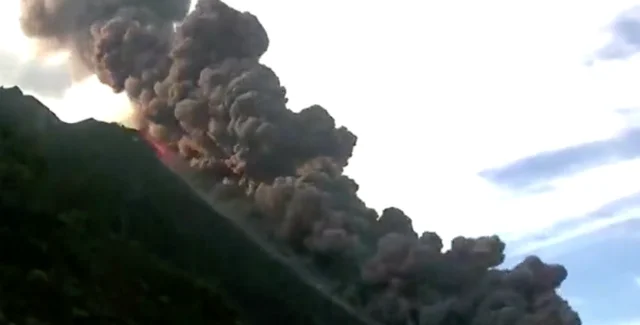 Вулкан проснулся на минувших выходных: в воскресенье он выбросил значительное количество пепла и дыма. Затем местные жители зафиксировали поток лавы, который сошел в море. В ночь на понедельник извержение повторилось.