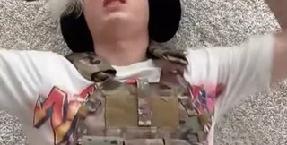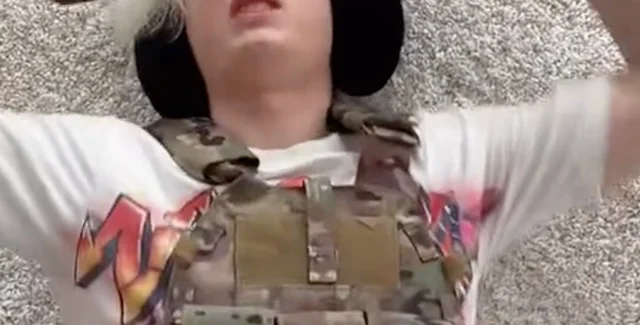 На кадрах блогер в камуфляжном жилете делает вид, что отбрасывает гранаты.