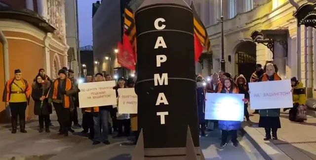 Участники шествия несли флаги СССР и георгиевские ленты, крича: "Бей, Сармат, по городам врага". Перед появлением макета ракеты вспомнили цитату Владимира Путина: "Мы, как мученики, попадем в рай, а они просто сдохнут".