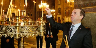 "Впрочем, малороссийские президентики и раньше не отличались крепостью веры. Молились только на бабло", — заявил Медведев, добавив, что верующих в Украине принуждают к посещению "правильных" церквей.