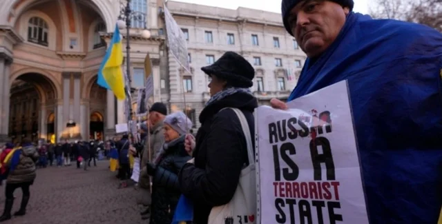 Демонстранты держали в руках сине-желтые флаги и плакаты с надписями: "Ла Скала не должна способствовать путинской пропаганде" и "Остановите войны, остановите Россию, остановите Путина".
