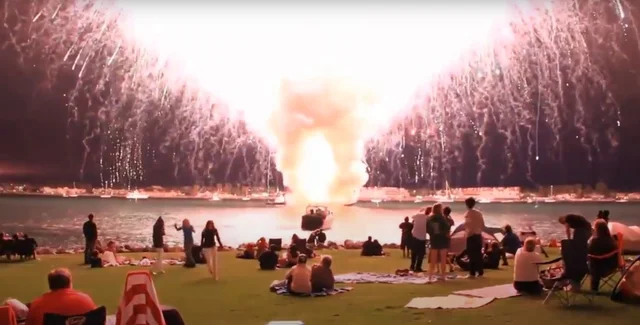 На кадрах можно заметить, что зрители поначалу заинтересовались происшествием, но активность фейерверка напугала некоторых девушек, которые стали убегать подальше от воды.