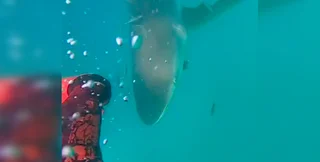 Инструктор по фридайвингу поймал нескольких омаров и рыб и собирался плыть к берегу, когда акула неожиданно сняла улов с его гарпуна. Затем появился еще один хищник.