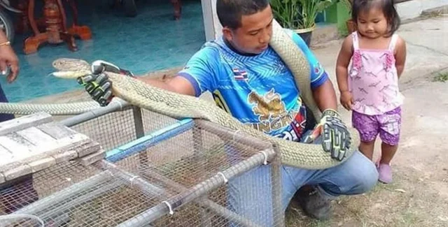 Семью напугала гигантская королевская кобра, лежавшая под стулом в их доме. Убрать незванного гостя приехала целая команда специалистов.