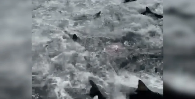 На снятых кадрах акулы буквально облепили лодку, видно, как морские хищники бьются о борт, и повсюду летят брызги.
