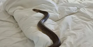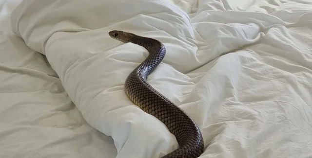Восточная коричневая змея была извлечена из дома компанией Zachery's Snake and Reptile Relocation, которая выложила в Facebook леденящие душу фотографии животного, лежащего на кровати.