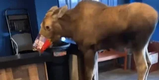 Компания Kenai Cinemas подтвердила, что лось забрел в фойе кинотеатра, порылся в мусоре, съел попкорн и засунул свою морду в коробку из "Хэппи Мил" от McDonald's, после чего ушел.