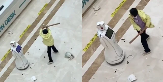 На видео, которое было загружено в социальную сеть Weibo видно, как женщина несколько раз бьет робота палкой в вестибюле больницы при медицинском университете Сюйчжоу.