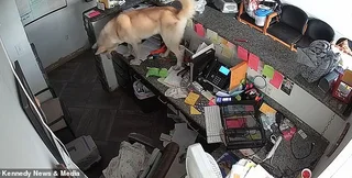 На видео, снятом камерой наблюдения, собака забирается на стол директора и свободно по нему разгуливает, очевидно, довольная зрелищем разрухи.
