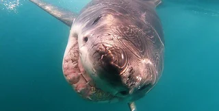 Крупный морской хищник приблизился прямо к объективу под водой. Этот случай произошел на глубине 10 метров рядом с пляжем Кляйн-Брак в южно-африканском городе Мосселбай.