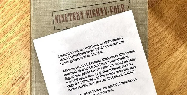 В библиотеке штата Орегон (США) сообщили, что недавно экземпляр книги Джорджа Оруэлла "1984" был возвращен с опозданием на 65 лет с извинительной запиской внутри.