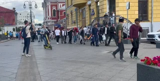 Вдоль колонны перемещают неизвестные лица на электросамокатах, которые рассматривают происходящее на московском проспекте. Также заметно несколько фотографов, которые фиксируют события.