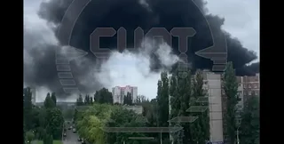 На записи видно, как столб черного дыма поднимается за жилыми многоэтажными домами. Причина пожара не называется.