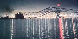 В ночь на 26 марта многотонный контейнеровоз врезался в опору трехкилометрового моста им. Фрэнсиса Скотта в Балтиморе, штат Мэриленд. В течение секунд полотно моста обвалилось в воду. О чрезвычайном происшествии в США рассказало издание The Guardian.