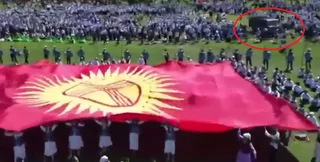 Сотни детей выстроились на открытой местности. Они растянули огромный флаг Киргизии и сопровождали это танцами. В какой-то момент появилось неуправляемое авто и просто поехало в толпу, сбивая детей на своем пути.