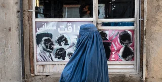 Женщина в Кабуле у вывески парикмахерской с замазанными лицами | Фото: Getty Images