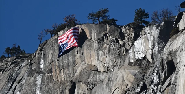 Флаг на склоне горы Эль-Капитан вывесили сотрудники парка Йосемити в знак протеста против недавнего сокращения численности персонала, которое проводилось в рамках инициатив администрации Трампа по сокращению расходов.
