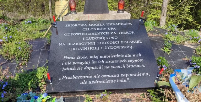 "Братская могила украинцев, членов Украинской повстанческой армии, ответственных за террор и геноцид против беззащитного польского, украинского и еврейского населения. Господи Боже, помилуй их и не отплати им за ужасные поступки, которые они совершили против своих братьев. Прощение не означает забвение, но исцеление боли", — говорится в тексте на доске.