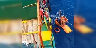 На опубликованных кадрах измученные рыбаки после нескольких дней в открытом море раскачиваются на волнах в ящиках, пока бригада нефтяной вышки подтаскивает их поближе и веревками вытягивает на борт.
