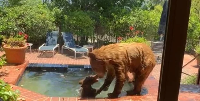 Владелица дома в южной части штата Калифорния сняла видео медведицы с медвежонком, которые купались в ее бассейне.