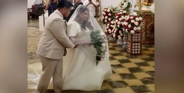Район, в котором проживали Пауло и Маэ Падилья, был затоплен после двух тайфунов, но они были полны решимости дойти до алтаря. К удивлению супругов, гостям также удалось добраться до церкви, пробираясь по воде в шлепанцах и резиновых сапогах.
