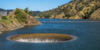 Издание отмечает, что в это рукотворное отверстие сбрасывается вода из озера Берриесса на плотине Монтичелло в Калифорнии для предотвращения наводнений. Плотина была построена в 1950-х годах и имеет диаметр 22 метра.